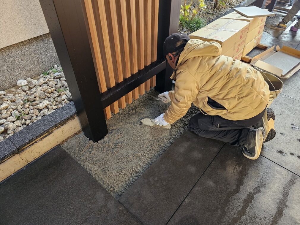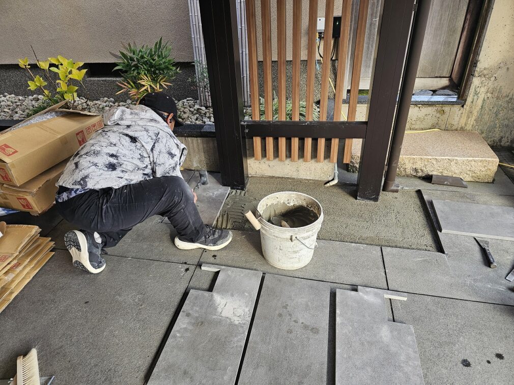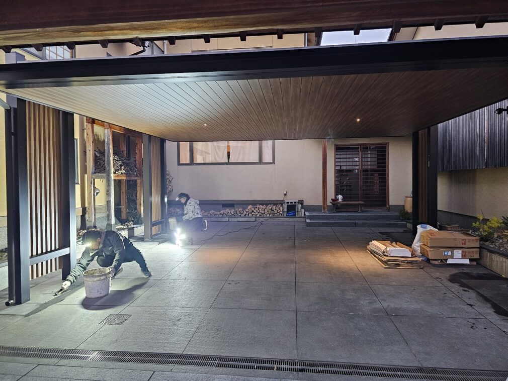 寒い中、暗くなって来た中、最後まで仕上げに頑張ってくれてるタイル職人さん達。